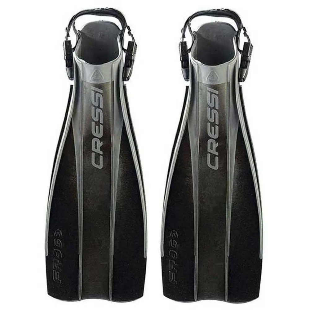 A classic in the Cressi range, this has been on the market for many years and has a huge number of appreciators in every corner of the planet. The fin is made with a skilful combination of a strong copolymer and a soft elastomer, the latter used for the foot pocket, for the side stringers and for some inserts. The blade originates from the upper part of the foot pocket, with a 20% increase in useful surface area compared to a traditional fin of the same length. The foot pocket is computer designed and offers great comfort; it guarantees excellent transmission of the leg-fin thrust. The Frog is heavier than the more recently designed equivalent Cressi models. It is this feature that makes it agreeable to whoever uses very thick suits or watertight suits. Anyone who works underwater will appreciate this fin a great deal because it is strong and comfortable, very popular also in diving schools and excellent for rental.