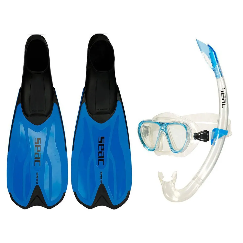 Set includes Spinta full-foot fins, a Bella silicone mask, and a Tribe snorkel with valve.